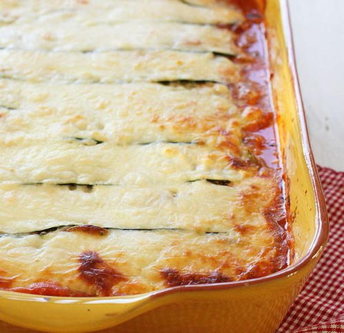 This recipe for Beefy Zucchini Lasagna replaces traditional lasagna noodles with thinly sliced zucchini. -