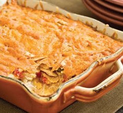 Nostalgic Tex-Mex Chicken Casserole is a colorful and easy chicken casserole recipe made with corn tortillas, veggies, cream of mushroom soup, Velveeta cheese, salsa, and topped with jalapeno peppers. It is a great dish to serve to family or guests. A staple in the 1970s at Texas church and potluck functions, this popular casserole recipe is a fan-favorite and easy to make. It will satisfy your Tex-Mex cravings in a flash. Make this weeknight main dish meal this week!
