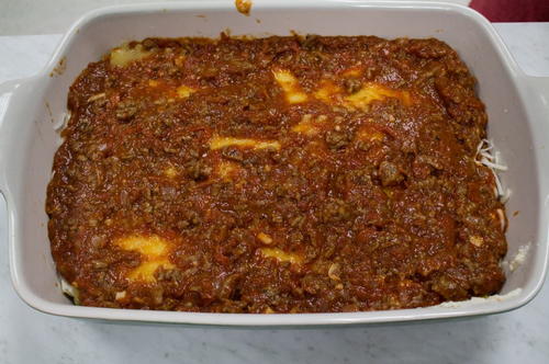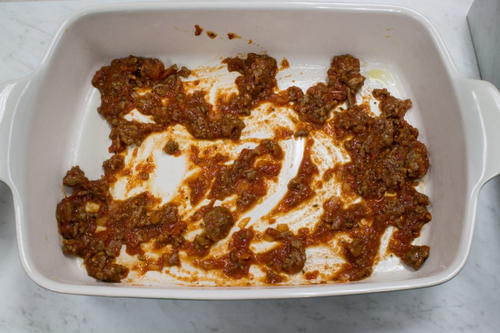Spread 1 cup of the tomato/meat mixture into the bottom of the baking dish.