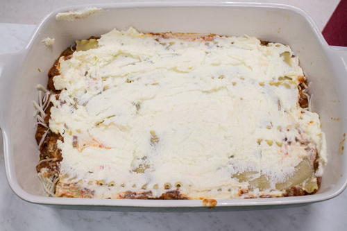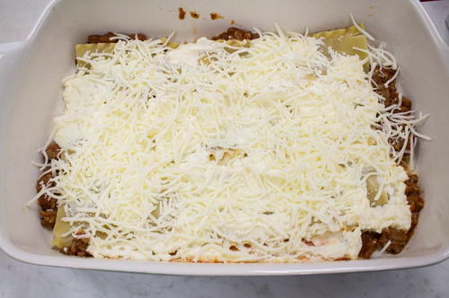 Top the noodles with half of the ricotta mixture and 1 cup of the mozzarella.