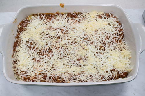 Top with remaining lasagna noodles, tomato/meat mixture, 1 cup mozzarella and remaining Parmesan.